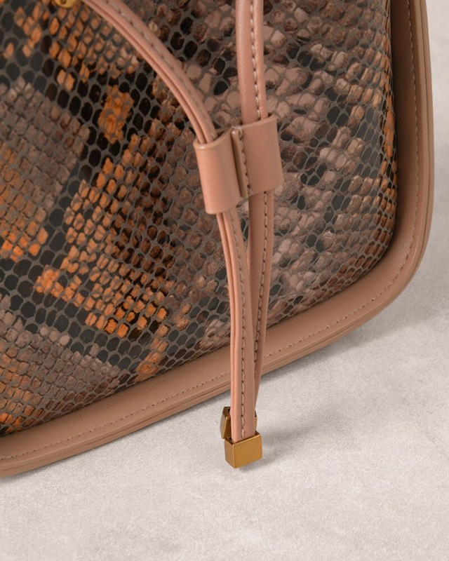 Mini drawstring bucket bags in snakeskin grained faux leather